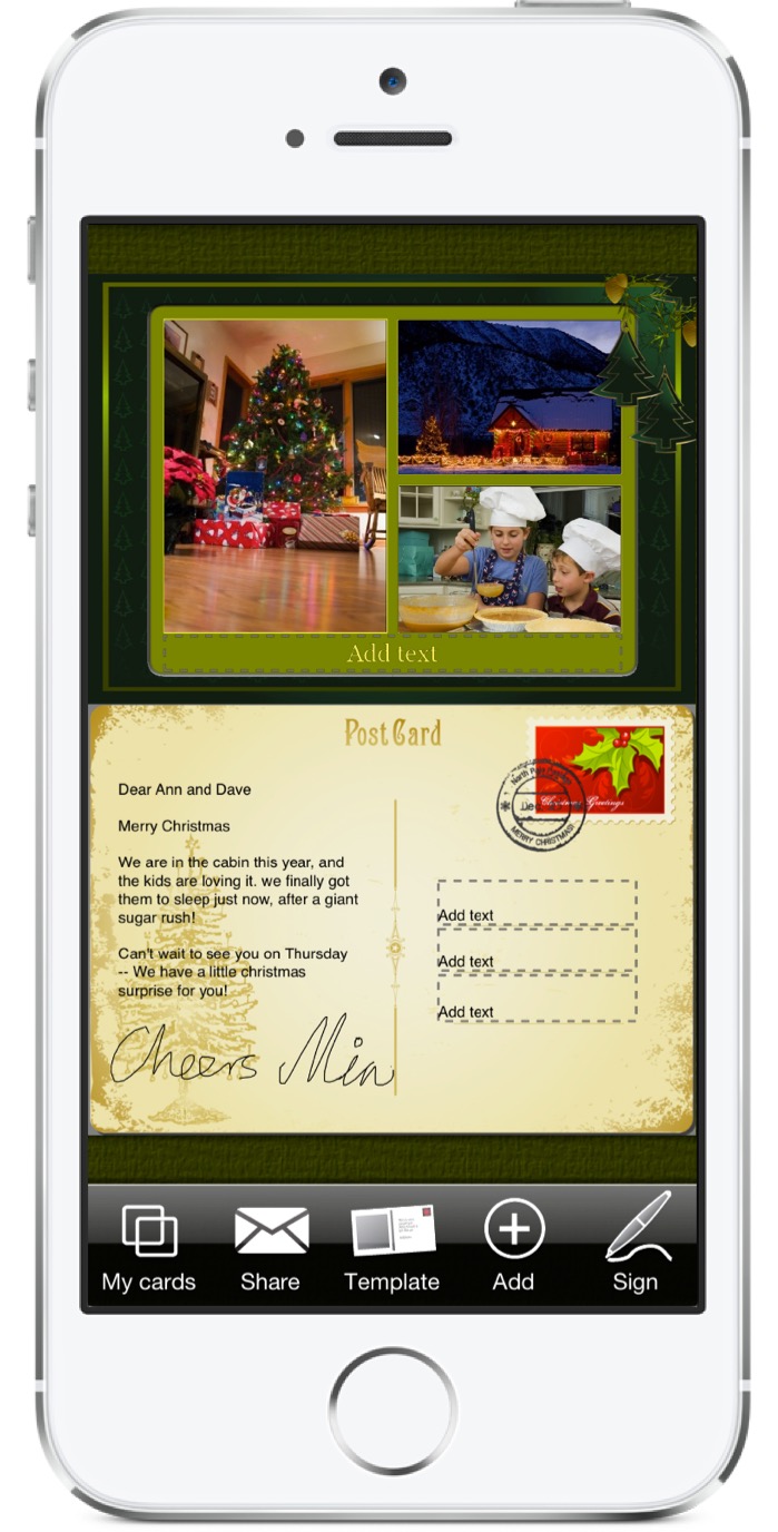 Christmas Lifecards uses the same state-of-the-art visual engine that Lifecards does, to push the iPhone to its limits by allowing free zoom and pan of the card while you edit it. You can insert, move, scale, and rotate photos from you photo-album. You can also insert texts and select font, color, size, and alignment.