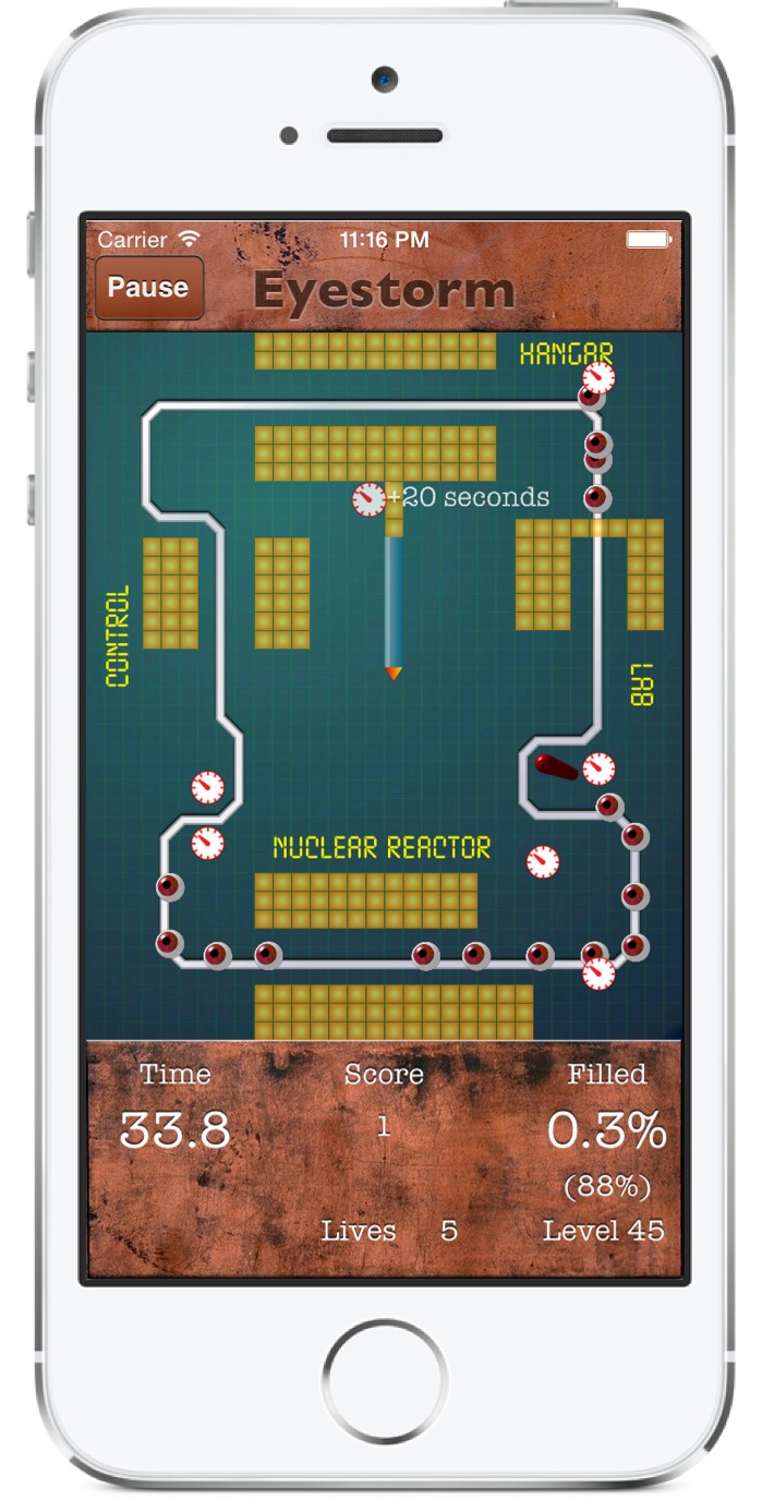 Eyestorm contains two major types of power-ups; Speed and time. Time power-ups will give you more time to finish the levels. Speed will increase your building speed, so that you can tackle fast-moving enemies. To pick up a power-up, close the region containing it. The power-up will work immediately after being picked up.