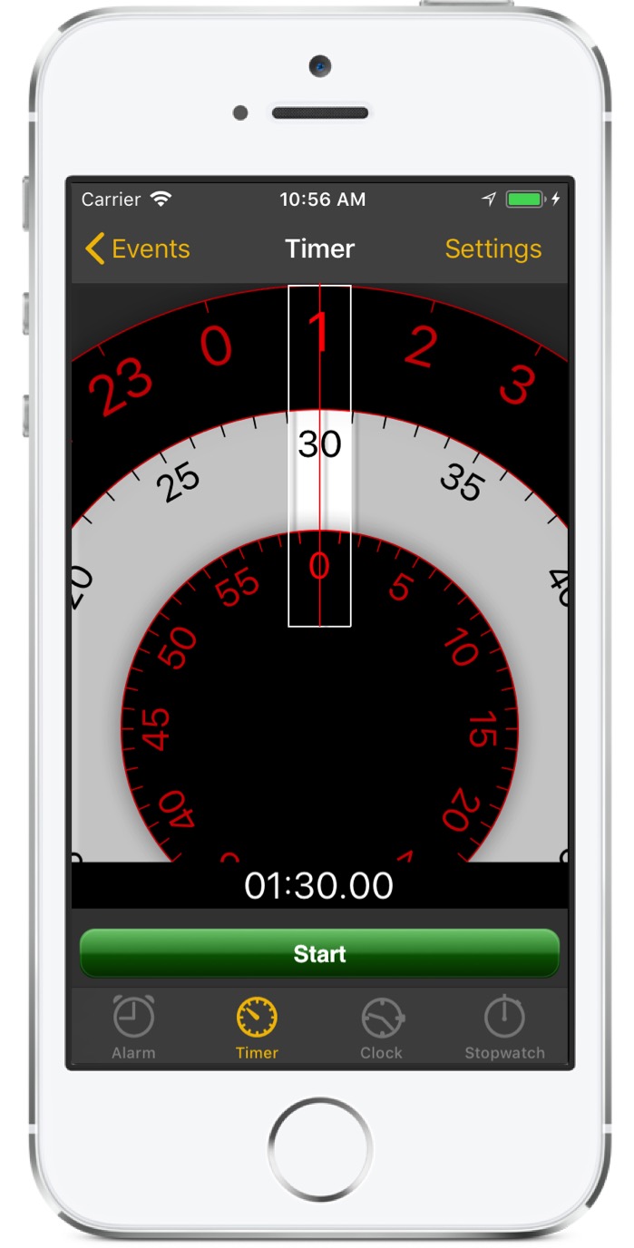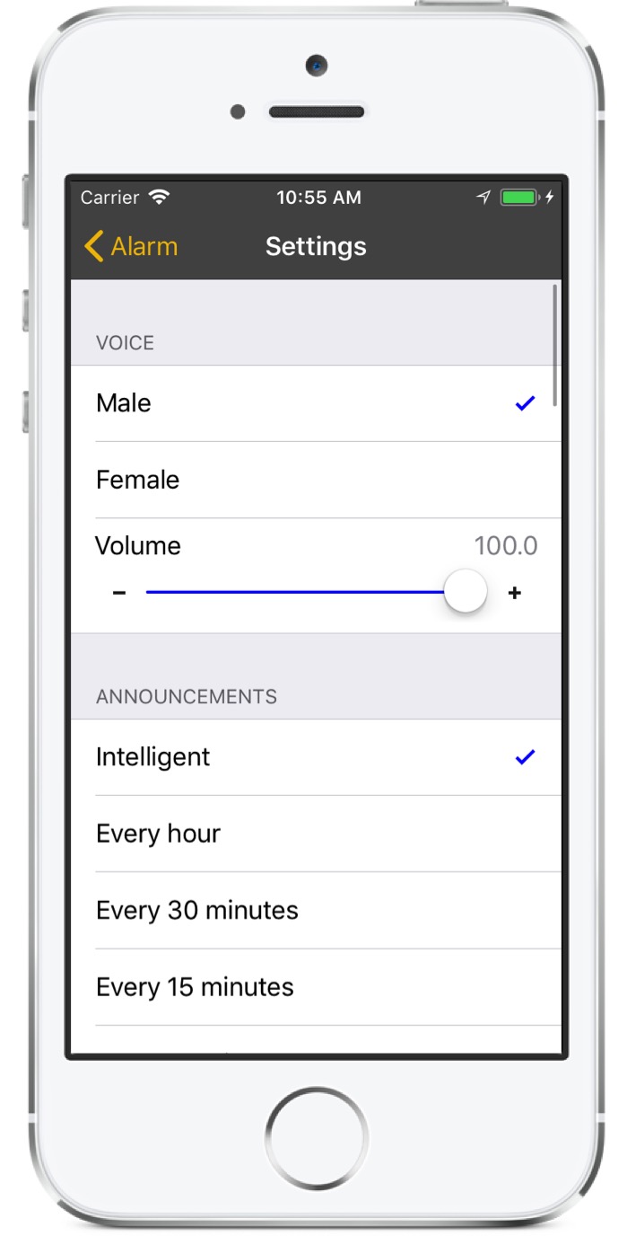 You can also setup timers. Let's say that you regularly exercise 60 minutes. Set up a timer to last 60 minutes and start the timer. Voice Alarm will then regularly tell you much time you have left of your exercise, and the notifications will occur more and more frequently as the full 60 minutes are approaching, or you may ask for notifications at specific intervals, e.g. every 15 minutes