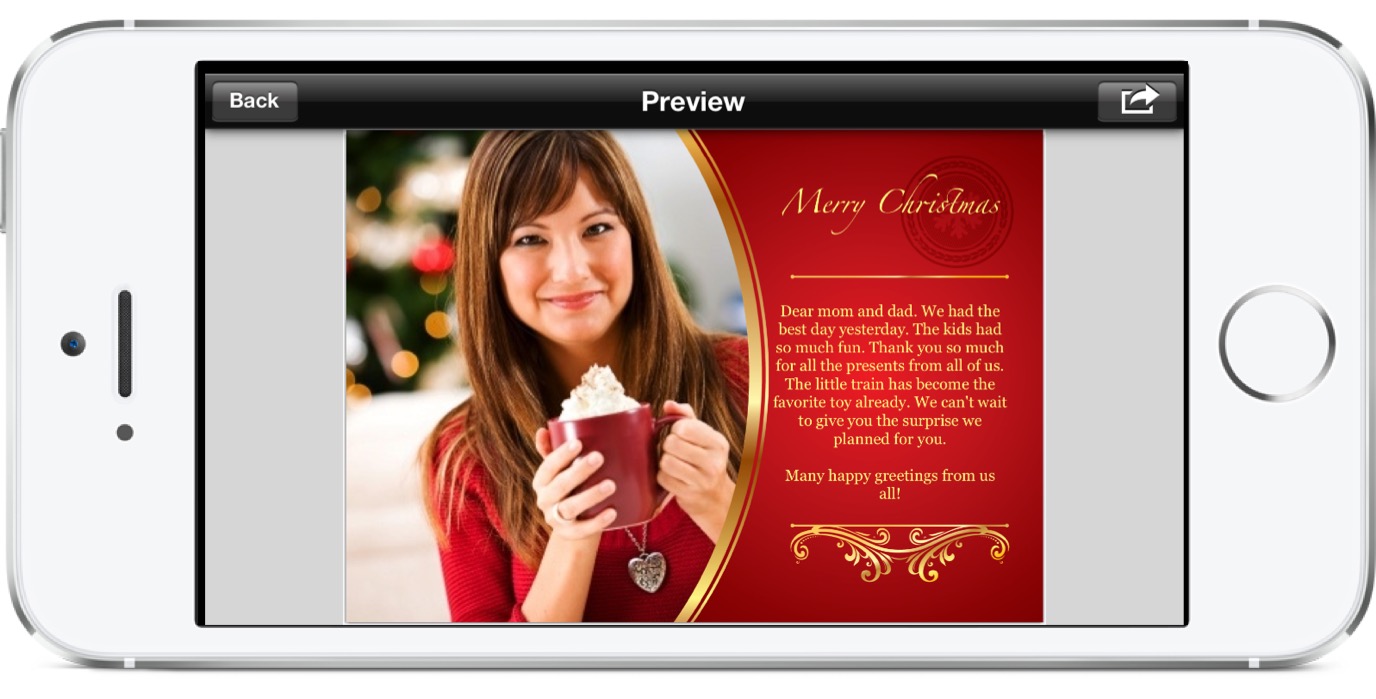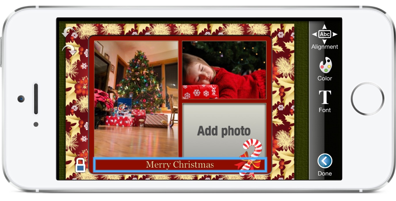 Christmas Lifecards uses the same state-of-the-art visual engine that Lifecards does, to push the iPhone to its limits by allowing free zoom and pan of the card while you edit it. You can insert, move, scale, and rotate photos from you photo-album. You can also insert texts and select font, color, size, and alignment.